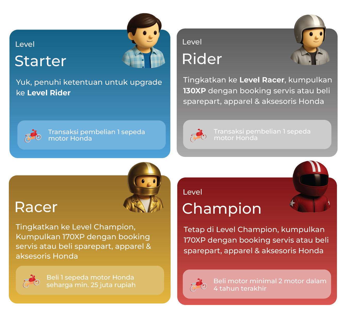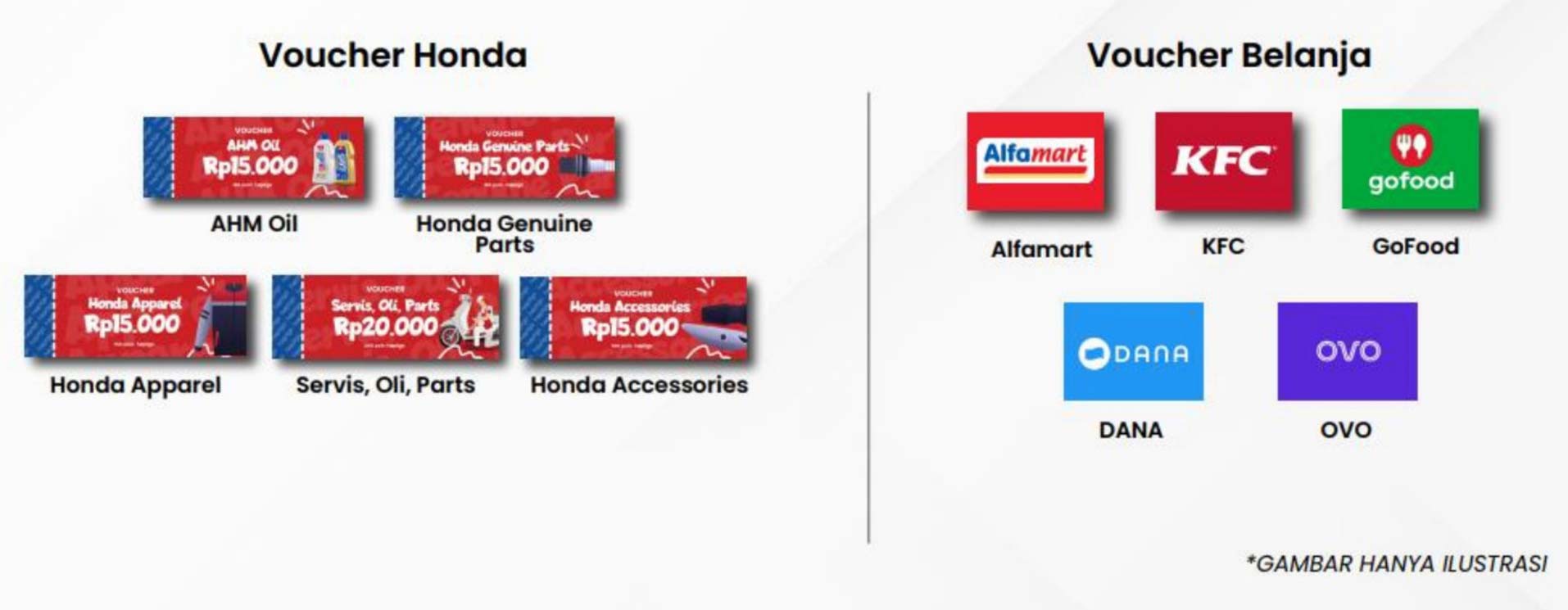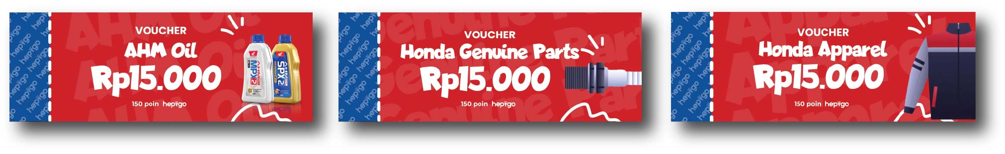 2. Dapat ditukarkan dengan voucher untuk memotong transaksi pembelian motor, servis, apparel dan aksesoris sepeda motor Honda di Dealer resmi